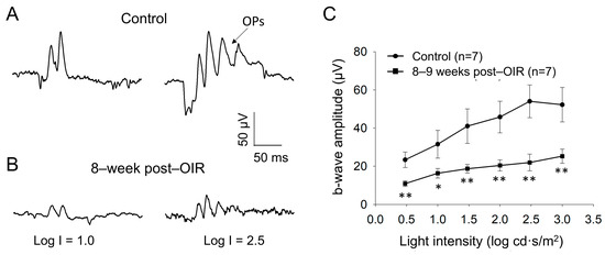 Although PERG responses originate from RGCs, they are shaped by input from upstream neurons (see details in Section 4) [14]. PERGs are routinely assessed under light–adapted conditions, which leads to the hypothesis that the cone pathway formed by cones and cone bipolar cells is impaired during the long–term post–OIR. To test this hypothesis, we examined light–adapted ERG from mice 8–9 weeks after OIR and age–matched controls in vivo. We delivered background illumination with an intensity saturating rod response to an eye for 10 min to light–adapt the retina. While the background light was continually delivered, we then applied a series of light pulses with intensities from 0.5 log cd·s/m2 to 3.0 log cd·s/m2 to the eye to evoke light–adapted ERGs. Figure 3A illustrates typical traces of light–adapted ERG at low (1.0 log cd·s/m2) and high (2.5 log cd·s/m2) intensities from a control mouse. In addition to a– and b–waves, there were oscillatory potentials (OPs) on the rising phase of the b–wave. Compared to the control mouse (Figure 3A), light–induced ERGs evoked by both intensities in a post–OIR mouse were attenuated (Figure 3B).