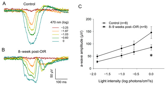 To determine whether cone function remains impaired under long–term post–OIR conditions, we switched our ERG recording from in vivo animals to ex vivo retina preparation [20]. Using this preparation, we were able to isolate an a–wave by pharmacologically blocking the b– wave with L–AP4, an agonist that selectively acts on group III metabotropic glutamate receptors on ON–bipolar cells [21]. As described in the Section 2, we delivered background light (470 nm, −2.82 log photons/cm2/s) to saturate rod responses. Simultaneously, we delivered 1–Hz flashing lights (470 nm, 20 ms, 0 log photons/cm2/s) for 5 min so that we could light–adapt the retina in order to obtain fully light–adapted cone responses. Figure 4A,B illustrate original traces of a–waves from a control retina and an 8–week post–OIR retina in response to a series of light intensities from −3.25 to 0 log photons/cm2/s (470 nm, 20 ms) in the presence of background light. The data show that the a–wave evoked with each intensity in the post–OIR retina was smaller in amplitude than that in the control retina. We further measured the peak amplitude of the a–wave and pooled the data collected from 8– to 9–week post–OIR retinas or from age–matched control retinas. We constructed an intensity response curve by plotting the mean peak amplitude of the a–wave at each intensity along with light intensities (Figure 4C). The curves show that the peak amplitude at each intensity in post–OIR mice was lower than that in control retinas. However, only the change in the highest intensity was statistically significant. Our data suggest that reduced cone function under post–OIR may partially contribute to the impairment of light–adapted ERG b–waves and P1–N2 of PERG.