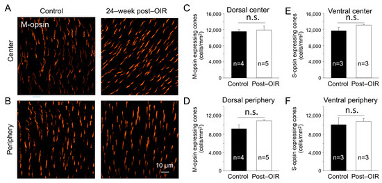 No significant changes of the cone density in post–OIR mice. S–opsin–expressing and M–opsin–expressing cones were immunostained in whole–mount retinas isolated from age–matched mice and mice 24 weeks after OIR. Images were taken for M–opsin–expressing cones from the center (A) and peripheral region (B) of the dorsal retina. The number of M–opsin–expressing cones was manually counted and then divided by the counted area to find the density. The average M–opsin–expressing cone density for the center and periphery was depicted in (C,D), respectively. Similar procedures were used for S–opsin–expressing cone imaging from the ventral retina where S–opsin is predominantly expressed. Subfigures (E,F) show the average S–cone density for the center and periphery, respectively. n.s, no significance.