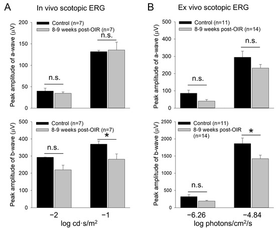 Reduced b–waves of in vivo and ex vivo scotopic ERGs in post–OIR mice. (A). In vivo dark–adapted full–field ERG a– and b–waves were recorded from 8– to 9–week post–OIR and age–matched control mice in response to 4 ms white light pulses with −1 or −2 log cd·s/m2 (1 log unit = 10 cd·s/m2), only stimulating rod photoreceptors. The peak amplitude of a–waves remained unchanged at both intensities (top panel). Significant changes in b–waves were observed at high intensity but not at low intensity (bottom panel). (B). Ex vivo dark–adapted ERGs showed similar results as in vivo dark–adapted ERGs. Top panel, a–waves; bottom panel, b–waves. The 470 nm light pulses with a 20 ms duration were applied at −6.26 or −4.84 log photons/cm2/s. Both intensities only stimulated rod photoreceptors. *, p < 0.05; n.s., no significance.