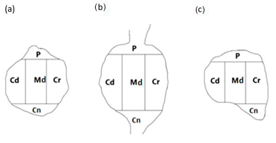 A schematic diagram of a DRG section showing its arbitrary division into topographical domains, in which the occurrence and relative frequency of PNX-containing sensory neurons was studied: P—peripheral domain, Cr—cranial domain, Cd—caudal domain, Cn—central domain of the DRG, Md—middle ganglion area; section from the (a) proximal, (b) middle and (c) distal part of the ganglion. The same mask was used in studies on the intraganglionic distribution of different chemically coded subpopulations of DRG neurons in previous studies [6].