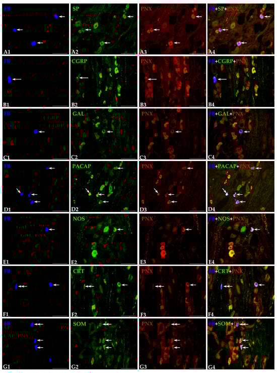 Representative images of dorsal root ganglia (DRG)-UB-ANs. The images were taken separately from blue (A1,B1,C1,D1,E1,F1,G1), green (A2,B2,C2,D2,E2,F2,G2) and red (A3,B3,C3,D3,E3,F3,G3) fluorescent channels. Pictures (A4,B4,C4,D4,E4,F4,G4) represent images in which the blue, green and red channels were digitally superimposed. The short arrows represent small-sized FB-positive DRG-UB-ANs (A1,C1,D1,E1,F1,G1) that were simultaneously PNX—(A3,C3,D3,E3,F3,G3) and substance P—(SP; A2), galanin—(GAL; C2), pituitary adenylate cyclase-activating polypeptide—(PACAP; D2), neuronal nitric oxide synthase—(nNOS; E2), calretinin—(CRT; F2) or somatostatin-positive—(SOM; G2). Long arrow represents middle-sized FB-positive DRG-UB-AN (B1) containing PNX (B3) and CGRP (B2). Double arrows indicate small-sized FB-positive DRG-UB-ANs (F1,G1) that contained CRT (F2) or SOM (G2) and were simultaneously PNX-negative (F3,G3). Scale bar in all the images—100 μm.