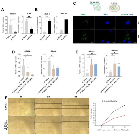 FS_OA_sEVs increase the expression of OA anabolic markers and reduce cell mobility in C_OAmin chondrocytes. (A,B) C_OAmin chondrocytes exhibit significant increase in COL2A1 and ACAN and decrease in MMP-3, and MMP-13 mRNA expressions compared to C_OAmax (n = 7). (C) PKH67-labeled FS_OA_sEVs after 24 and 48 h co-culture with C_OAmin reveal green fluorescence at chondrocytes’ perinuclear region (scale bar = 50 μm). (D,E) Treatment of C_OAmin chondrocytes with FS_OA_sEVs results in increased expression of anabolic markers and significantly reduced expression of catabolic markers (n = 5). (F) Images from scratch assay experiment at three different time points. C_OAmin and C_OAmin + FS_OA_sEVs were plated into 6-well plates and wounded with a pipette tip, and migration into the gap (visualized as two parallel dotted black lines) was measured with ImageJ software. * p < 0.05; ** p < 0.01; *** p < 0.001; ns = no significance.