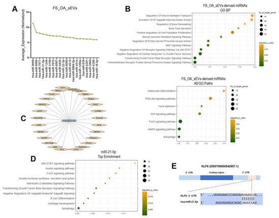FS_OA_sEVs miRNAs landscape. (A) Top 20 expressed miRNAs in FS_OA_sEVs. (B) Dot plot with −log10 (p-adjusted) indicating GO BP terms and KEGG paths of the top 50 expressed FS_OA_sEVs-derived miRNAs. (C) miR-21-5p predicted mRNA targets. (D) GO terms and KEGG paths of miR-21-5p mRNA targets visualized by dot plot with −log10. (E) Schematic representation of a predicted miR-21-5p binding site in KLF6 mRNA 3′UTR.