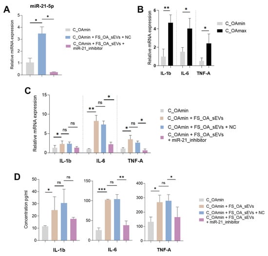 FS_OA_sEVs-derived miR-21-5p delivery into C_OAmin induces inflammation. (A) miR-21-5p exhibits significantly increased expression in FS_OA_sEV-treated chondrocytes compared to untreated cells; co-treatment with miR-21-5p inhibitor results in marked reduction in its expression (n = 5). (B) C_OAmin chondrocytes exhibit low expression of inflammatory markers (IL-1β, IL-6, and TNF-α) compared to C_OAmax (n = 7). (C,D) IL-1β, IL-6, and TNF-α gene expression and cytokine secretion levels are reduced in FS_OA_sEVs/miR-21-5p inhibitor-treated group compared to FS_OA_sEVs-only group (n = 5). * p < 0.05; ** p < 0.01; *** p < 0.001; ns = no significance.