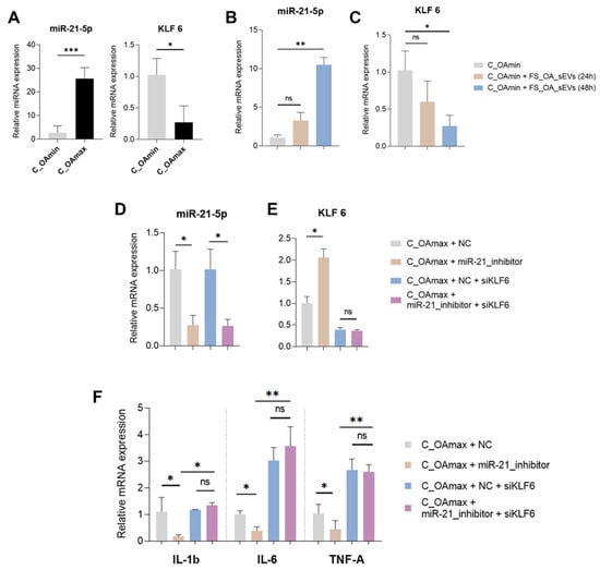 miR-21 promotes inflammation in C_OAmax chondrocytes via KLF6 inhibition. (A) C_OAmin chondrocytes exhibit decreased miR-21-5p and increased KLF6 mRNA expression compared to C_OAmax (n = 7) (B,C) Treatment of C_OAmin chondrocytes with FS_OA_sEVs leads to increase in miR-21-5p expression and decrease in KLF6 mRNA expression. (D,E) Successful miR-21-5p suppression after miR-21-5p inhibitor (n = 4); C_OAmax chondrocytes treated with miR-21-5p inhibitor show significant increase in KLF6 expression compared to negative inhibitor-treated cells (n = 4). (F) IL-1β, IL-6, and TNF-α mRNA expression levels are significantly reduced compared in C_OAmax chondrocytes to NC-treated cells; miR-21-5p inhibitor/siKLF6-treated C_OAmax show significantly increased IL-1β, IL-6, and TNF-α expression levels compared to miR-21-5p inhibitor-only cells (n = 4). * p < 0.05; ** p < 0.01, *** p < 0.001; ns = no significance.