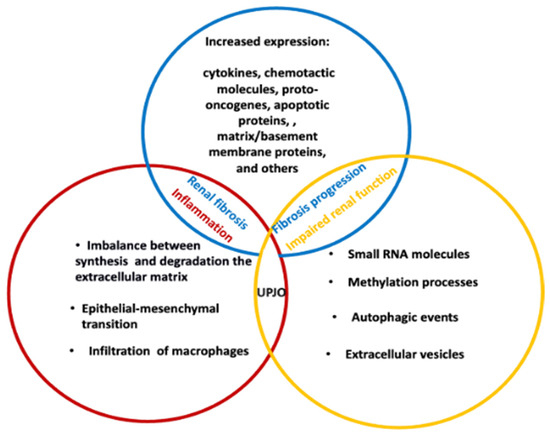 Taken together, all the above studies suggest that the dysregulation of molecules/proteins involved in specific signaling pathways, as well as the release of EVs enriched with bioactive factors (and potential biomarkers), contribute through various processes to the onset of renal fibrosis, a factor linked to the development of UPJO.