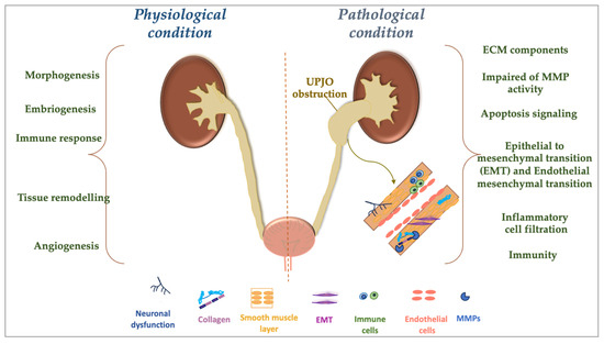 Cartoon representing the consequences that UPJO can trigger in children or adults during the prenatal and/or postnatal period. On the right, the figure identifies the pathological condition of UPJO with the dilation of the pelvis of the kidney (hydronephrosis), accompanied by the onset of a plethora of processes, including an increase in the ECM components, impaired MMP activity, and the induction of apoptotic processes, with a consequent increase in infiltration by immune cells, as well as the development of the EMT together with the EndoMT. On the left, the figure represents the physiological condition that can be observed in the urinary system of a healthy subject.