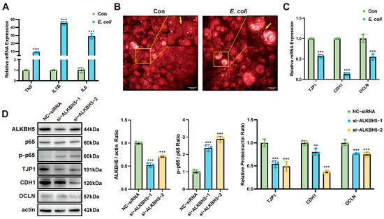 ALKBH5 inhibits E. coli-induced MAC-T cell tight junction disruption. (A) E. coli induced upregulation of TNF, IL1B, and IL6 mRNA expressions in MAC-T cells (24 h infection). Measured by RT-qPCR, normalized to ACTB; (B) E. coli induced tight junction disruption in MAC-T cells (24 h infection), yellow arrows indicate inter-cellular junction. Scale bar = 20 µm; (C) E. coli-induced down-regulation of TJP1, CDH1, and OCLN mRNA expressions in MAC-T cells (24 h infection). Measured by RT-qPCR, normalized to ACTB; (D) ALKBH5 knockdown induced p65 phosphorylation and inhibited TJP1, CDH1, and OCLN protein expressions. MAC-T cells transfected with ALKBH5 siRNA (24 h) followed by E. coli infection (24 h). Analyzed by Western blotting, with actin as loading control. Data are mean ± SD (n = 3 replicates per group, 3 independent experiments). ** p < 0.01, *** p < 0.001.