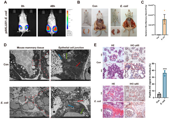 E. coli induces mice mastitis and disrupts epithelial cell tight junctions. (A) Small animal live imaging demonstrating the proliferation and spread of bioluminescent E. coli in the mammary glands of mouse; (B) Appearance, dissection, and mammary tissue of control and E. coli-infected mouse; (C) Bacterial load measurement in mammary tissue of control and E. coli-infected mouse. Data are presented as median bacterial load (CFU/g); (D) TEM observation of the damage of mouse mammary gland epithelial cell junction. Blue arrows indicate mitochondria, green arrows indicate nucleus, and red arrows indicate epithelial junction structures. Scale bar = 2 µm; (E) HE and IHC detection of mammary tissue of control and E. coli-infected mouse, and quantification of p65 nuclear translocation by IHC. Scale bar = 50 µm. Data are presented as mean ± SD (n = 6 mice per group), *** p < 0.001.
