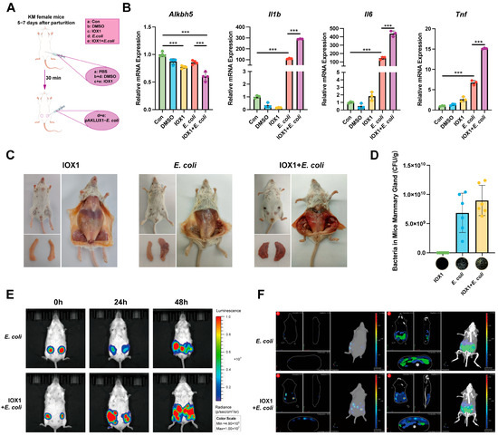 One male and two female mice were housed together and mated freely, and the females were separately housed after pregnancy. Female mice were separated from the infancy mice and were fasted and dehydrated for 2 h, 5–7 d after delivery. The mice were then intraperitoneally injected with either an IOX1 solution (14.182 mg/kg, dissolved in 5% DMSO), an equal volume of 5% DMSO, or PBS, with each mouse receiving a volume of 150 µL. Female mice were anesthetized and positioned supine, and the fourth pair of mammary glands and the surrounding skin were disinfected with 75% alcohol after 30 min. A blunt 1 mL syringe was used to inject pAKLUX1-E. coli saline suspension at 2 × 107 CFU/mL of 50 μL into the mammary glands and the nipples were disinfected with iodine after the injection.