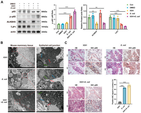 Inhibition of ALKBH5 aggravates epithelial cell tight junction disruption. (A) WB detected up-regulation of ALKBH5 and p-p65, and down-regulation of TJP1 in mouse mammary tissues during IOX1 induction. β-actin was used as a loading control; (B) TEM imaging of mammary glands of mice in the IOX1 group, the E. coli group, and the IOX1 + E. coli group. Blue arrows indicate mitochondria, green arrows indicate nucleus, and red arrows indicate epithelial junction structures. Scale bar = 2 µm; (C) HE and detection of mouse mammary tissue from the IOX1, E. coli, and IOX1 + E. coli groups, and quantification of p65 nuclear translocation by IHC. Scale bar = 50 µm. Data are presented as mean ± SD (n = 6 mice per group), ** p < 0.01, *** p < 0.001.