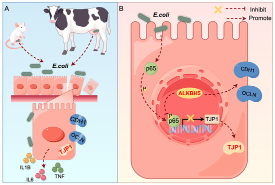 Schematic diagram of ALKBH5 protecting cell tight junction. (A) E. coli-induced mastitis disrupts epithelial cell tight junction; (B) ALKBH5 protects epithelial cell tight junction.