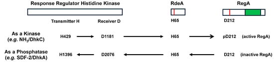 RegA: RegA, a class I phosphodiesterase, contains a C-terminal catalytic domain specific for cAMP hydrolysis (Figure 2) [,,]. RegA has an upstream response regulatory (RR) receiver domain and functions as a part of an intracellular two-component phospho-relay system (Figure 2 and Figure 3) [,,]. An activated histidine kinase (RR-HK) autophosphorylates a transmitter histidine, which undergoes intramolecular phosphotransfer to a receiver aspartate; intermolecular phosphotransfer to H65 of RdeA; and then to D212 of RegA, which leads to RegA activation (Figure 3) [,,,,,]. An inactive RR-HK can also function as a phosphatase, leading to the inactivation of RegA (Figure 3; Table 1) [,,,,].