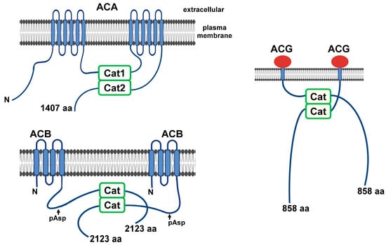 ACG is modeled as a single-pass TM protein with a single intracellular catalytic domain (Figure 4) []. By analogy to activated ACA, two ACG molecules are suggested to dimerize for catalytic activity. The extracellular domain of ACG may function as an osmosensor (Figure 4) [].