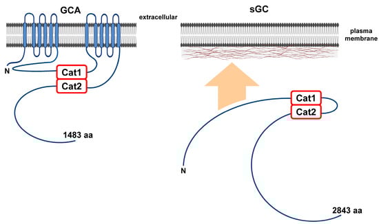Structures of the guanylyl cyclases in Dictyostelium. GCA is a classic 12-transmembrane domain guanylyl cyclase. It possesses two intracellular catalytic domains that can be activated when dimerized. sGC is structurally analogous to soluble adenylyl cyclases found in mammalian cells. sGC possesses two intracellular catalytic domains that are active when dimerized. Still, sGC is found as both cytosolic and membrane-bound forms. The N-terminal region of sGC allows for association with cortical F-actin. sGC possesses a second function in chemotaxis that is independent of its guanylyl cyclase activity.