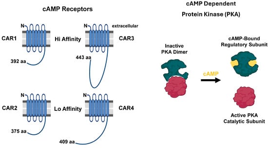 Secreted, extracellular cAMP is recognized by membrane-bound G-protein coupled cAMP receptors (CARs) (Figure 6) [,,,,,,]. There are four cAMP receptors, CAR1, CAR2, CAR3, and CAR4, with different affinities for cAMP []. CAR1 is predominantly present on the cell surface during the early chemotaxis and aggregation stages (Figure 1), whereas CAR3 is maximal at aggregation; both have high affinity for cAMP [,]. CAR2 and CAR4 expression occurs at later stages during cytodifferentiation, and they have lower affinities for cAMP []. CAR3 and CAR4 have prominent roles in cell fate specification (Figure 1) [,,,,].