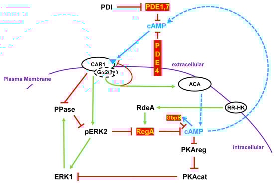 With the inactivation of ACA and the activity of RegA (and GbpB), intracellular cAMP levels are degraded, and cAMP secretion is halted. Extracellularly, PDE1, PDE4, and PDE7 clear cAMP, removing the CAR1 stimulus. Cells are, thus, returned to a basal, but an unresponsive, state (Figure 8) [,].