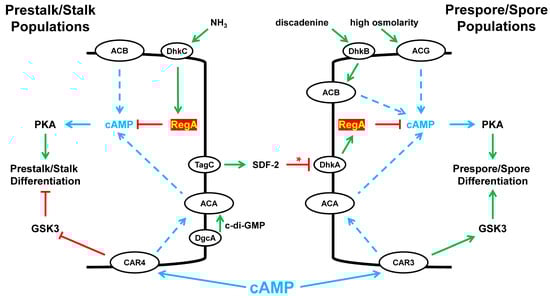 During culmination (Figure 1), the coordinated interactions of prestalk/prespore cells, with the requirement of TagC in prestalk cells, release the prespore-specific RegA inhibitor SDF-2 (Figure 10) [,,,]. SDF-2 interacts with the RR-HK DhkA [] that can then act as a functional phosphatase of RegA (Figure 3) []. The precise mechanism is not described, but for consistency, SDF-2 actions are schematically described as an inhibitor of DhkA, permitting phospho-transfer away from RegA and inhibition. Regardless, the inhibition of RegA induces PKA. ACB and ACG provide other intracellular cAMP inputs [,,]. The precise timing of RegA inhibition is critical, as regA-mutant cells exhibit premature sporulation. ACB and ACG provide other sources for intracellular cAMP accumulation, which is required for sporulation [,,]. For ACB, activation is suggested to require an RdeA-independent phospho-transfer from the RR-HK DhkB, with input from discadenine []. Cells lacking ACB exhibit defects in terminal spore differentiation []. Finally, the germination of spores to growth-phase cells is inhibited by highly active ACB and ACG. Thus, discadenine and elevated osmo-concentrations block germination.