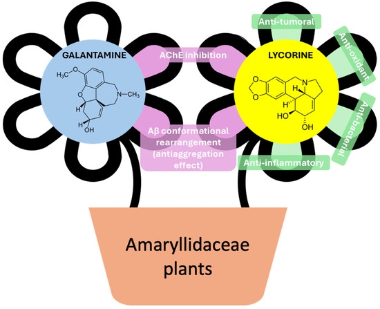 - Kola, A.; Lamponi, S.; Currò, F.; Valensin, D. A Comparative Study between Lycorine and Galantamine Abilities to Interact with AMYLOID β and Reduce In Vitro Neurotoxicity. Int. J. Mol. Sci. 2023, 24, 2500. [Google Scholar] [CrossRef]