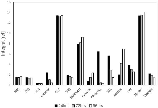 Relative integrals of selected metabolites measured by NMR in the culture medium of SH-SY5Y cells incubated for 24, 72, and 96 h. The integral [rel] values are normalized relative to the NMR signal area of TMSP-d4, used as an internal reference standard.