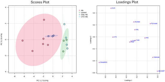 Principal component analysis (PCA) plots illustrating the effects of exposure of Aβ42 alone or in presence of LYC and GAL on the metabolic profiles of SH-SY5Y cells. The left panel (Scores Plot) illustrates the distribution of different experimental groups based on PCA analysis. Each point represents a sample, with different colors corresponding to the following conditions: Aβ42 (red), control (green), GAL + Aβ42 (blue), and LYC + Aβ (light blue). The ellipses indicate 95% confidence regions for each group. PC1 and PC2 explain 73.8% and 10.4% of the variance, respectively. The right panel (loadings plot) displays the contribution of specific metabolites to the PCA model, where metabolites such as GLN, GlutaMAX, and LYS are the primary contributors to the variance observed in the scores plot.