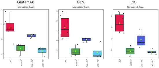 Box plots of normalized metabolite concentrations across experimental conditions. Each panel represents the distribution of a specific metabolite among the four experimental groups: Aβ42-treated (red), control (green), GAL + Aβ42 (blue), and LYC + Aβ42 (light blue). The yellow diamonds indicate the mean values, while black dots represent individual data points.
