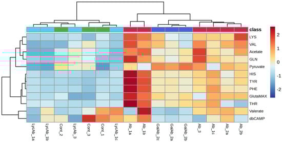 The same metabolites were also identified as key VIP (variable importance in projection) scores (VIP > 1) in the PLS-DA analysis performed on the same dataset (Figure S3). This further supports their relevance in distinguishing different experimental conditions, reinforcing their role as metabolic markers in response to the Aβ42, GAL + Aβ42, and LYC + Aβ42 treatments. In particular, the heatmap with hierarchical clustering reported in Figure 5 provides a visual representation of metabolite variations across different experimental conditions, offering a clear overview of how metabolites change in response to treatments. The columns correspond to different samples, which appear to be grouped by experimental conditions, while the rows represent specific metabolites. The color scale indicates the relative concentration of each metabolite, where red shades represent higher concentrations, blue shades indicate lower concentrations, and neutral colors (yellow) reflect intermediate levels. The dendrograms on both axes illustrate hierarchical clustering, grouping samples and metabolites with similar profiles together. In particular, Figure 5 shows the presence of two distinct sample clusters: one for the control and LYC + Aβ42 samples and the other for the Aβ42 and GAL + Aβ42 samples. The first cluster, which includes the control and LYC + Aβ42 samples, is predominantly characterized by blue-colored metabolites, reflecting lower metabolite concentrations. Conversely, the second cluster, consisting of Aβ42 and GAL + Aβ42 samples, is mainly represented by red-colored metabolites, indicating higher metabolite levels. However, exceptions to this general trend are observed for acetate, THR, and pyruvate, exhibiting larger variability across all the samples.