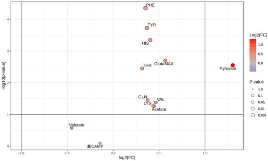 Volcano plot representing metabolite differences between experimental groups. The x-axis shows the log2 fold change (log2(FC)) of metabolite abundance, while the y-axis represents the log10 (p-value), indicating statistical significance. Metabolites with higher significance appear toward the top of the plot. Color intensity corresponds to log2(FC), with red indicating upregulated metabolites and purple indicating downregulated ones. The dot size reflects the p-value, where larger points indicate higher significance. Pyruvate exhibits the most significant upregulation, while Valerate and db-cAMP show a trend towards downregulation with very low statistical significance. The dashed horizontal line represents the threshold for statistical significance.