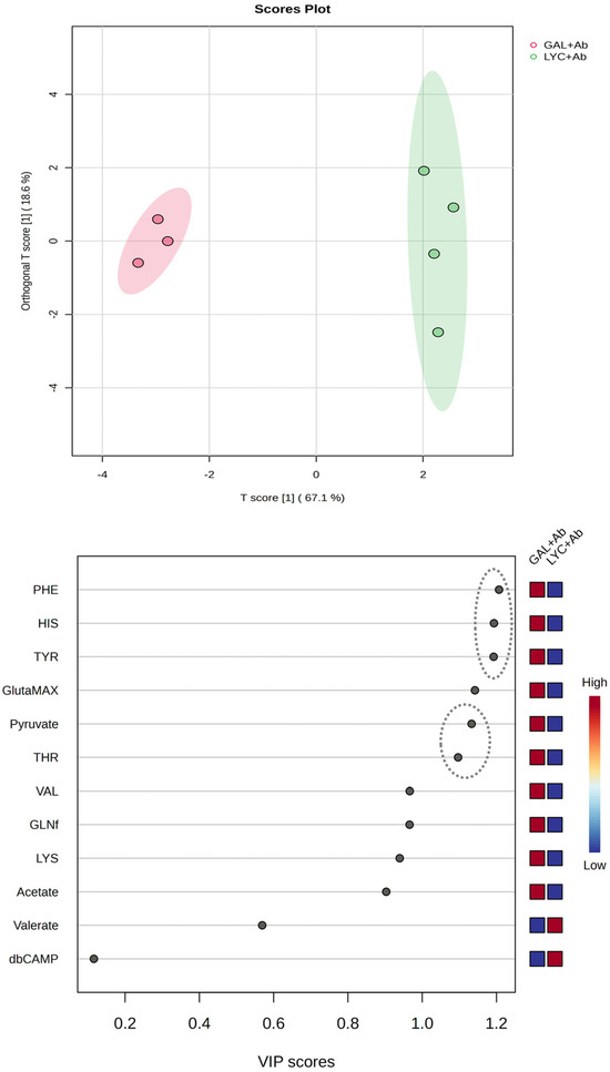 Orthogonal partial least squares discriminant analysis (O-PLS-DA) model evaluating the variance between GAL + Aβ and LYC + Aβ groups (R2X = 0.671, R2Y = 0.964, Q2 = 0.927). The scores plot (top) shows a clear separation between the two groups along the first component (T score [1], 67.1%; R2), with an orthogonal component (orthogonal T score [1], 18.6%) capturing non-predictive variance. The VIP scores plot (bottom) highlights the most relevant metabolites contributing to class differentiation. Newly identified metabolites with VIP scores > 1 are indicated with circles.