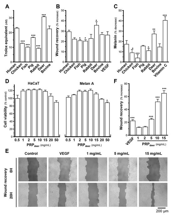 PRPdeer shows better effectiveness than other sources of PRP samples. Different animal sources, all at 5 mg/mL of PRP, were subjected to various assays of skin function A–C. (A) The anti-oxidation ability of different PRPs was determined by a commercial kit. The data are expressed as trolox equivalents. (B) Confluent HaCaT monolayers were scratched with sterile pipette tips; images illustrating wound healing were taken at 0 h (At0) and 20 h (At20). Quantitation of migration was calibrated as the following formula: (At0–At20) × 100%/At0. (C) Different PRPs (5 mg/mL) were applied onto cultured melanocyte (Melan-A) cells for 48 h, and a melanogenesis assay was determined. (D) Different concentrations (0.5–50 mg/mL) of PRPdeer were applied onto cultured HaCaT and Melan A cells for 48 h, and an MTT assay was determined. (E) Cultured HaCaT cells created a wound; PRPdeer (1–15 mg/mL) was applied for 20 h. Images illustrating wound healing were taken at 0 h (At0) and 20 h (At20). (F) Quantitation of migration was calibrated. The values in mean ± SEM., n = 8. * p < 0.05; ** p < 0.01; *** p < 0.001 compared with corresponding human or control.