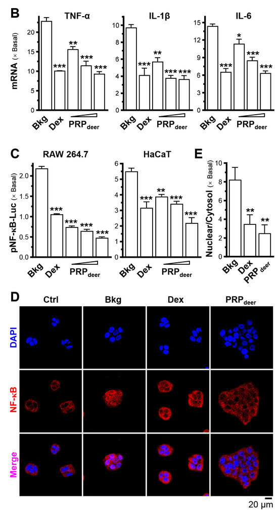 PRPdeer reduces the induced inflammatory responses. (A) The mRNA levels of iNOS, IL-1β, and IL-6 were measured in inflammatory activated cultured RAW264.7 cells after being pretreated with PRPdeer (1, 5, 10 mg/mL) for 4 h. Then, the exposure of LPS (100 ng/mL) was 20 h. Dexamethasone at 10 nM was a positive control. (B) The mRNA levels of TNF-α, IL-1β, and IL-6 in cultured HaCaT cells after 4 h of pretreatment of dexamethasone (10 nM) and PRPdeer (10 mg/mL), and 20 h of TNF-α (20 ng/mL) stimulation. (C) The pNF-κB-Luc plasmid was transfected into RAW264.7 or HaCaT cells for 4 h, followed by pretreating with PRPdeer (1, 5, 10 mg/mL) for 4 h, before the exposure to LPS (100 ng/mL) or TNF-α (20 ng/mL), respectively, for 20 h. Dexamethasone (10 nM) served as a control. (D) The protein level of NF-κB p65 in cytosolic and nuclear cells was measured in HaCaT keratinocytes, in representative confocal images. (E) The quantifications of intensity percentage in (D). The values are expressed in the fold of change to the normalized basal activity set at 1, in mean ± SEM., n = 8. * p < 0.05; ** p < 0.01; *** p < 0.001 compared with LPS- or TNF-α-treated groups (Bkg).