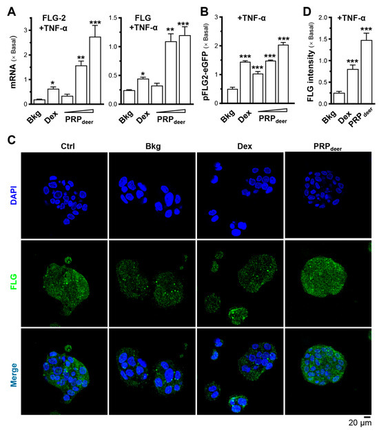 PRPdeer reverses the decrease in filaggrin and filaggrin-2 expressions caused by TNF-α by promoting moisturization and differentiation. The cultured HaCaT keratinocytes were pretreated with dexamethasone (10 nM), PRPdeer (1, 5, 10 mg/mL) for 4 h. Then, the exposure of TNF-α (20 ng/mL) was 20 h. (A) The mRNA levels of filaggrin (FLG) and filaggrin-2 (FLG-2) were evaluated by RT-PCR. (B) The pFLG2-eGFP plasmid was transfected into HaCaT cells for 4 h, followed by another 4 h pre-incubation of PRPdeer before 20 h stimulation of TNF-α. Dexamethasone was a control. (C) HaCaT keratinocytes were treated with TNF-α, dexamethasone, PRPdeer (10 mg/mL), as given in (A). The cultures were stained with FLG antibodies or DAPI. Representative fluorescence images are displayed. (D) The FLG intensity was quantified from (C). Values are normalized basal expression set at 1, in mean ± SEM., n = 5. * p < 0.05; ** p < 0.01; *** p < 0.001 compared with TNF-α-treated group (Bkg).