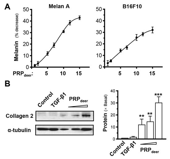PRPdeer regulates the levels of melanin and collagen. (A) Cultured melanocytes (Melan-A) and melanoma (B16F10) were plated onto 6-well plates. PRPdeer (1 to 15 mg/mL) was administered for 48 h, and the melanin content was assessed. Vitamin C (10 μM, positive control) demonstrates an approximate 40% reduction. (B) Cultures were treated as in (A), and collagen 2 (~141 kDa) was evaluated by Western blot assays; α-tubulin (~55 kDa) served as internal control for quantification (left panel). TGF-β1 (10 ng/mL, positive control). The quantification was conducted by ImageJ software (2.1.4.5) (right panel). Values are expressed as the percentage of decrease in the control or the fold of change relative to normalized basal expression set at 1, in mean ± SEM., n = 5. ** p < 0.01; *** p < 0.001 compared with the control.