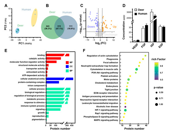 Proteomics analysis of PRPdeer and PRPhuman. (A) PCA scores for proteomic analysis of PRPdeer and PRPhuman. (B) Venn diagram showing the overlapping and unique proteins in PRPdeer and PRPhuman. (C) Volcano plot analysis of proteomic changes in PRPdeer and PRPhuman. (D) The amounts of VEGF, FGF, IGF, and EGF in PRPdeer and PRPhuman were measured by ELISA. (E) GO analysis of proteins enriched in PRPdeer. (F) KEGG displays the top 20 pathways analysis of PRPdeer proteins.