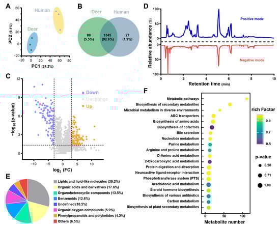 Metabolomics analysis of PRPdeer and PRPhuman. (A) PCA scores for metabolomics analysis of PRPdeer and PRPhuman. (B) Venn diagram showing the overlapping and unique metabolites in PRPdeer and PRPhuman. (C) Volcano plot analysis of metabolite changes in PRPdeer and PRPhuman. (D) Extracted ion chromatogram of PRPdeer metabolomic. (E) Chemical categories of metabolites in PRPdeer. (F) KEGG displays the top 20 pathways analysis of PRPdeer metabolites.