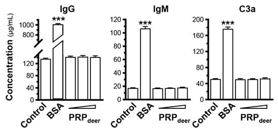 Immunostimulatory analysis of PRPdeer. After treated with bovine serum albumin (BSA, 1 mg/kg) or PRPdeer (50, 100, and 200 mg/kg) for 1 month with weekly intravenous injection, the amounts of IgG, IgM, and C3a in the serum of mice were measured by ELISA. The values are in mean ± SEM., n = 10. *** p < 0.001 compared with control.