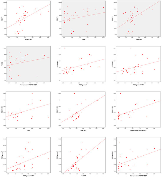 Significant correlations were observed among FOXP3, RORγt, and T-bet expression and their median fluorescence intensity (MFI). FOXP3 MFI showed a strong positive correlation with FOXP3 % (r = 0.642, p < 0.001) and T-bet MFI (r = 0.503, p < 0.001). RORγt % correlated significantly with RORγt MFI (r = 0.537, p < 0.001) and T-bet MFI (r = 0.411, p < 0.001), indicating potential interplay in immune regulation. Co-expression of RORγt and T-bet % was significantly associated with all measured markers, particularly FOXP3 MFI (r = 0.586, p < 0.001) and RORγt % (r = 0.565, p < 0.001). These findings suggest a complex regulatory network among FOXP3, RORγt, and T-bet in immune modulation (Table 12 and Figure 7).