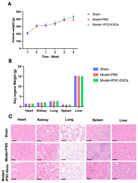 3.3. iPSC-Exosome Injection Is Safe, with No Evidence of Toxicity Observed