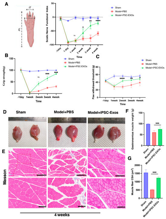 3.6. iPSC-Exos Prevented Gastrocnemius Muscle Atrophy Following Sciatic Nerve Injury