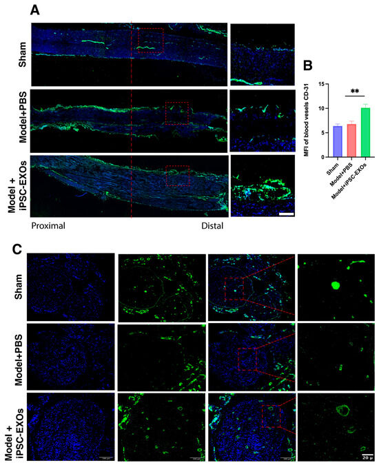 3.7. iPSC-Exos Promotes Axon Regeneration, Myelination, and Angiogenesis Following Sciatic Nerve Injury