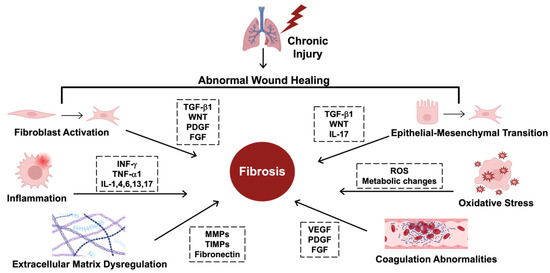The hallmarks of fibrosing disorders. The mechanisms driving fibrosis are complex and include several key regulators. Starting at the upper left, fibroblast activation and transformation into myofibroblasts is regulated by transforming growth factor beta (TGF-β1), wingless-related integration site (WNT), platelet-derived growth factor (PDGF), and fibroblast growth factor (FGF). Epithelial–mesenchymal transition (EMT), where epithelial cells transform into myofibroblast-like cells, is regulated by TGF-β1, WNT, and interleukin-17 (IL-17). Several key cytokines drive inflammation, including interferon gamma (INF-γ) and tumor necrosis factor (TNF-α1), along with various interleukins, including IL-1, 4, 6, 13, and 17. Due to these transformations, there are also metabolic changes that form reactive oxygen species (ROS) that induce oxidative stress, contributing to fibrosis. Extracellular matrix (ECM) dysregulation includes the overproduction of collagen and disorganized extracellular structures due to abnormalities in the key enzymes that shape the ECM, including matrix metalloproteinases (MMPs), tissue inhibitors of matrix metalloproteinases (TIMPs), and increased fibronectin. Coagulation abnormalities also contribute to fibrosis and are mediated by vascular endothelial growth factor (VEGF), PDGF, and FGF. This figure was created using BioRender elements https://biorender.com/ (accessed on 6 August 2024).