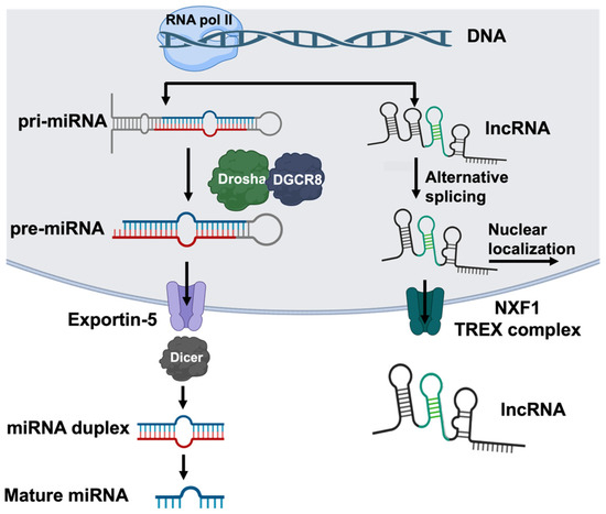 The biosynthesis of miRNAs and lncRNAs. miRNAs and lncRNAs are transcribed by RNA polymerase II, often from intronic or intergenic regions. The transcription of miRNA (left) produces a capped and polyadenylated primary microRNA (pri-miRNA) containing a characteristic hairpin and single-stranded RNA structure. The Drosha-DGSR8 complex cleaves the junction of the single-stranded RNA and hairpin to produce the precursor miRNA (pre-miRNA), which is exported to the cytoplasm via exportin-5. In the cytoplasm, Dicer further processes the pre-miRNA into 20–22-nucleotide double-stranded RNA duplexes that then split to form mature miRNA. The transcription of lncRNA (right) forms long transcripts that are capped, polyadenylated, and alternatively spliced. lncRNAs predominantly localize to the nucleus; however, a fraction of the molecules are exported via Nuclear RNA export factor 1 (NXF1) or the Transcription Export Complex (TREX). This figure was created using BioRender elements https://biorender.com/ (accessed on 6 August 2024).