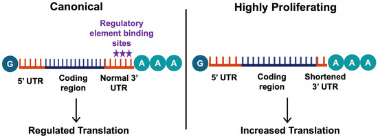 The mechanisms of alternative polyadenylation. Alternative polyadenylation involves differing polyadenylation sites, which influences the stability and level of translation of the transcript. In most healthy cells, the canonical distal polyadenylation site is preferred (left), leading to transcripts with long 3′UTRs allowing their translation to be regulated by various elements (stars indicate the common binding site of these elements). On the other hand, highly proliferating or differentiating cells prefer proximal polyadenylation sites, leading to 3′UTR shortening. This results in an increased translation of these transcripts, as the shorter mRNA variants often do not have translation-inhibiting elements in their 3′UTRs (right). This figure was created using BioRender elements https://biorender.com/ (accessed on 6 August 2024).