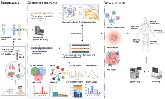 (1) Extract samples: The initial phase involves the meticulous preparation of research samples comprising both human and mouse B cells, and we can utilize Fluorescence-Activated Cell Sorter (FACS) to select either total B cells or B-cell subsets of interest for single-cell sequencing. This step ensures the integrity and representativeness of the cellular material for downstream analyses. (2) Sequencing and analysis: We can obtain data from scBCR-seq and scRNA-seq for each B cell. scRNA-seq: This component delves into the intricacies of B cell subsets, unraveling their unique transcriptional signatures and transcription factor profiles. scBCR-seq: Concurrently, scBCR-seq dissects the BCR repertoire, providing insights into the diversity and specificity of B cell receptors. scRNA + BCR-seq Integration: By integrating both methodologies, the correspondence between B cell subsets and their antigen-specific responses is elucidated, revealing their response characteristics to various antigens. (3) Eventual results: The synergistic power of scRNA + BCR-seq transcends traditional boundaries. It enables a comprehensive understanding of B cell function in diverse contexts, including anti-infection, antitumor, and autoimmune responses. Furthermore, when combined with cutting-edge techniques such as single-cell ATAC-seq (for chromatin accessibility) or single-cell CITE-seq (for simultaneous detection of proteins and transcripts), this approach opens up a vast array of applications in disease diagnosis, monitoring disease progression, personalized treatment strategies, immune status assessment, and even the optimization of vaccine designs.