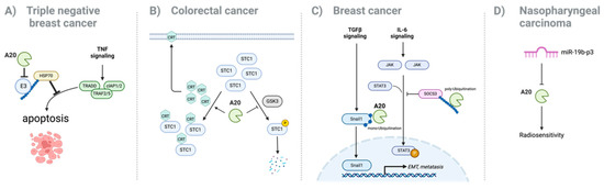 In addition to breast, melanoma, gastric, and colorectal cancers, A20 has been implicated in the progression of various other malignancies, including endometrial cancer, adrenocortical carcinoma, cholangiocarcinoma, bladder cancer, esophageal carcinoma, and thyroid cancer [41,42,43,44,45,46,47]. In nasopharyngeal carcinoma, A20 is a direct target of miR-19b-3p. Knockdown of A20 reduces sensitivity to irradiation, whereas upregulation of A20 expression reverses the inhibitory effects of miR-19b-3p on cell radio-sensitivity [48] (Figure 1D). These findings show the role of A20 as an oncogene in various cancer types. However, further understanding is necessary to highlight the multifaceted roles of A20 in cancer biology (Table 1).