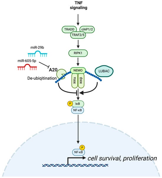 In NSCLC, the role of NF-κB has been extensively studied using mouse models, revealing its critical involvement in tumor development and progression [60]. For example, inhibition of the NF-κB pathway, such as IKKα or IKKβ, reduces lung inflammation and tumor growth and improves survival [61,62]. In A20-deficient models with oncogenic K-Ras activation and p53 loss, enhanced NF-κB activity was associated with increased tumor development, whereas inhibiting NF-κB reduced tumor formation [63]. Another study demonstrated that NF-κB promotes lung inflammation and tumor growth by activating immune cells, such as tumor-associated macrophages, and recruiting regulatory T cells, to generate a pro-tumorigenic inflammatory microenvironment [64]. Moreover, certain miRNAs promote NSCLC progression by regulating A20 expression in NSCLC. miR-29b leads to the activation of NF-κB signaling by targeting A20 to confer apoptosis resistance in NSCLC cells [65]. In addition, miR-605-5p suppresses A20 expression, facilitating cell invasion and proliferation in NSCLC [66] (Figure 2). These results suggest that A20 plays a tumor-suppressing role in NSCLC as a NF-κB negative regulator.