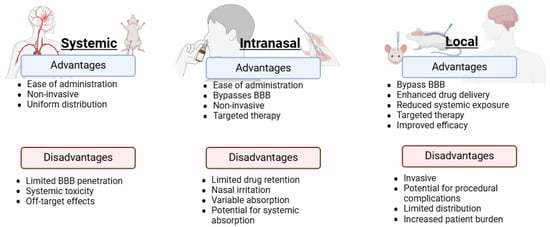 With the physiological barriers to the brain, delivery of therapeutics to the CNS remains a challenge. Currently, there are three major routes of EV-based drug delivery: systemic administration, local administration, and intranasal administration. Each route of administration poises unique challenges and advantages (Figure 2).