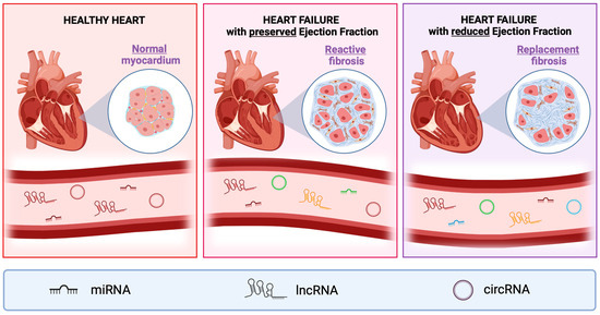 Structure of the heart under healthy and pathological conditions, with differing levels of circulating ncRNAs in the bloodstream. In the healthy heart, the myocardium is predominantly populated with cardiomyocytes. The bloodstream contains various ncRNAs, including microRNAs (miRNAs), long non-coding RNAs (lncRNAs), and circular RNAs (circRNAs). In HFpEF, the LV wall is thickened, and the myocardium undergoes reactive fibrosis. Circulating ncRNAs (miRNAs, lncRNAs, circRNAs) are altered in expression (indicated by different colours), indicating their role in the fibrotic and HF processes. In HFrEF, the LV wall is thinned and accompanied by replacement fibrosis, with loss of cardiomyocytes. The expression profiles of circulating ncRNAs are altered in HF, indicating their potential as biomarkers for disease subtypes [7,8,10]. Acronyms: HFpEF, heart failure with preserved ejection fraction; HFrEF, heart failure with reduced ejection fraction. Created in BioRender, https://BioRender.com/e51z267 (accessed on 27 December 2024).