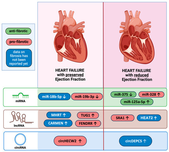 The overview of ncRNAs reported as circulating biomarkers in HFpEF and HFrEF is illustrated in Figure 3.